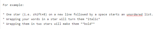 - One star (i.e. shift+8) on a new line followed by a space starts an unordered list.